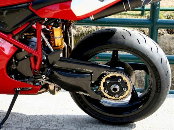 Na red je stiglo više manjih zahvata poput montaže leitunga, ručki, prekidača, kablova, gumenih crijeva, pogonskog lanca i zupčanika, akumulatora… Na kraju, kad je mehanički dio posla bio gotov, ostalo nam je još montirati nove Ducati Performance karbonske dijelove koji koštaju pravo malo bogatstvo ali bez kojih 916 jednostavno ne može: oba blatobrana, štitnici hladnjaka, kvačila, zupčanika, ispušnih cijevi, zadnje vilice i lanca, undertail, airbox te Ducati Performance oslonce za noge od ergala, prednji zatamnjeni vjetrobran i sjedalo. Kao šećer za kraj ostavili smo ultra lagane magnezijske felge na koje smo montirali nove Michelinke.